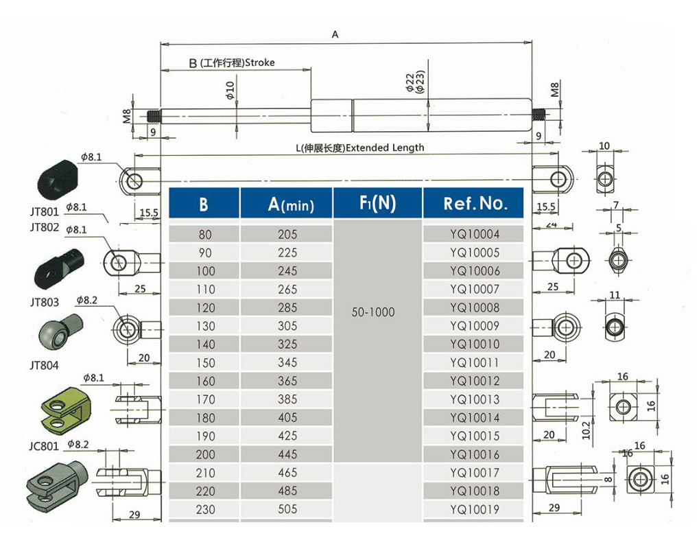 注:由于氣彈簧是非標準的,以上僅為型號的一部分。我們可以根據客戶的要求定制。